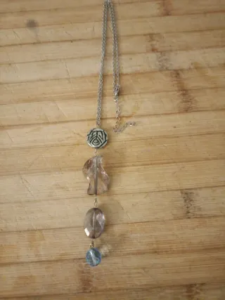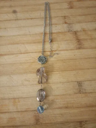 Collar artesanal con un diseño único y elegante. - Colgante principal con diseño tribal. - Tres cuentas de piedra natural en tonos marrones y azules. - Cadena de plata ajustable.