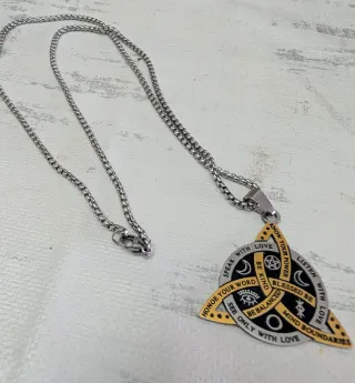Collar con un diseño de nudo de bruja vikinga, que combina detalles dorados y plateados. El colgante tiene inscripciones inspiradoras. - Diseño de nudo de bruja vikinga. - Inscripciones: Know Your Power, Listen With Love, Blessed Be, Mind Boundaries, Be Balanced, Be Kind, Speak With Love, Hono Your Word, See Only With Love. - Símbolos: Luna creciente, pentagrama, ojo, runa, círculo.