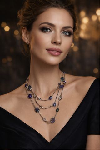 Este collar de la marca Swarovski es una pieza elegante y llamativa. Su diseño combina piedras en tonos morados y detalles plateados, creando un accesorio sofisticado. - Diseño de múltiples hilos. - Piedras de cristal facetadas.