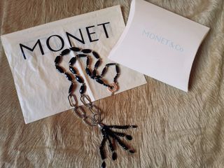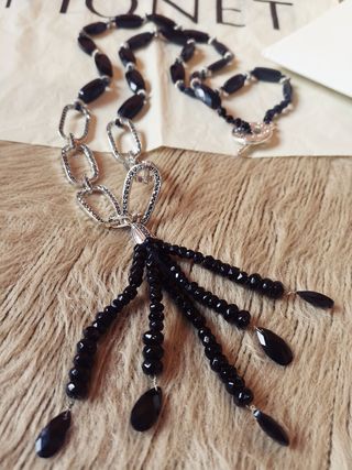 Espectacular collar de la marca Monet. Alta bisuteria con piedras Onix negras, plateado y con pequeños brillantes que lucen muchísimo. Queda precioso puesto para lucirlo en cualquier evento. Solo se ha usado una vez, por lo que esta totalmente impecable. Comprado en El Corte inglés.