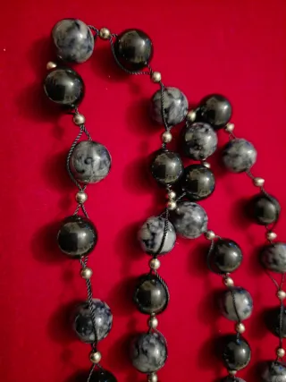 Elegante collar largo de aproximadamente 1 metro de longitud. - Elaborado con cuentas de piedra en tonos grises y negros. - Diseño con cuentas intercaladas de metal plateado.