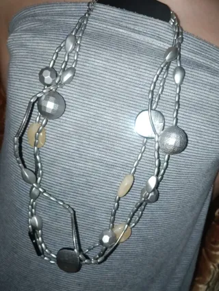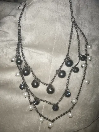 ✨ Elegante collar multicapa con un diseño delicado. - Cuentas metálicas en tono plateado. - Perlas artificiales intercaladas. - Cierre de mosquetón.