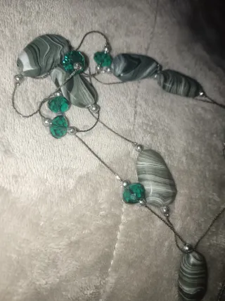 ✨ Elegante collar largo con un diseño de dos vueltas. Presenta una combinación de piedras en tonos verdes y grises, intercaladas con pequeñas cuentas plateadas.