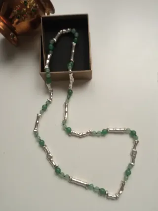 Elegante collar largo con cuentas verdes de ágata y zamak plata. - Cuentas de color verde. - Elementos metálicos plateados con caprichosas formas. - Diseño sofisticado y moderno. (Entrega con estuche ) - Ideal para cualquier ocasión.