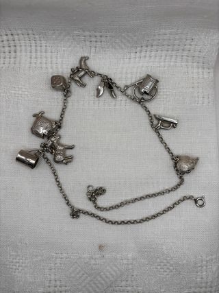 Collar de plata de ley holandesa 835 con 9 dijes. El collar mide 51 cm de largo. - Dijes variados como un dado, un pez, un zapato, un cubo, un animal, un patito y un patín. - Cierre de mosquetón. - Peso total 19.2 g