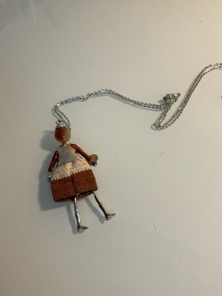 Collar con colgante de muñeca detallada. - Colgante con figura de muñeca. - Cadena de eslabones plateada. - Cierre de mosquetón.