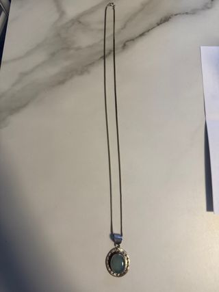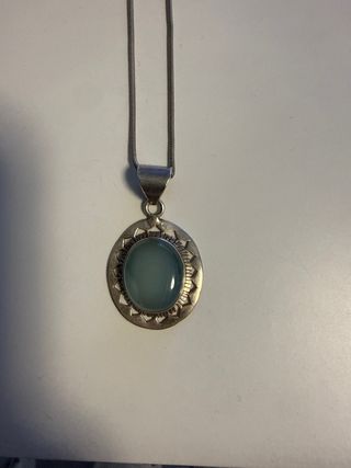 Elegante collar con colgante de plata y una piedra de color azul. - Colgante ovalado con borde texturizado. - Cadena fina tipo serpiente.