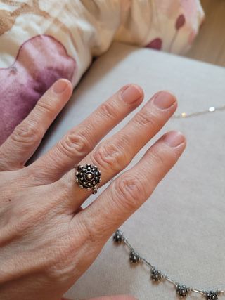Elegante conjunto de joyería artesanal estilo charro, compuesto por un collar y un anillo. - Diseño floral detallado. - Acabado en plata. - Piezas únicas para complementar tu estilo.