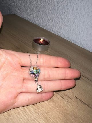 Elegante collar con colgante de globo aerostático adornado con circonitas de colores y una base de cristal. - Cadena de plata. - Colgante detallado con múltiples gemas.