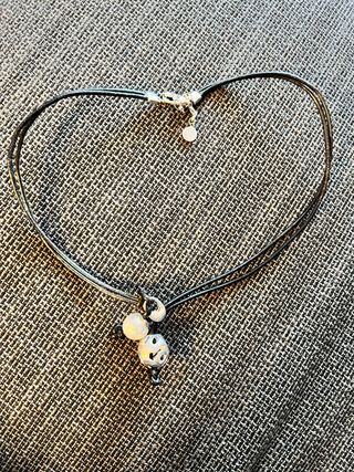 Elegante collar con un diseño único. - Cadena doble de cuero negro. - Colgante con perla Majorica y bola labrada de plata. - Cierre de mosquetón plata.