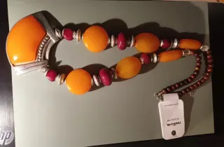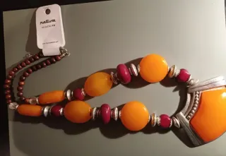 Collar de la marca Natura con un diseño único. - Pieza central en forma de media luna. - Elaborado con cuentas de ámbar y detalles en color burdeos. - Cadena con cuentas de madera oscura. Accesorio llamativo elegante. Detalle metálico plateado entre las cuentas. Colgante principal en forma de media luna. Libre de níquel. Nuevo. A estrenar.