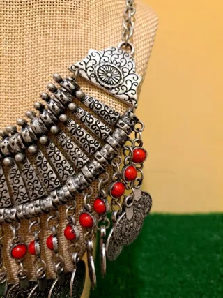 Elegante collar de estilo árabe con un diseño llamativo. - Detalles de monedas plateadas. - Abalorios de cuentas rojas. - Diseño de inspiración étnica.