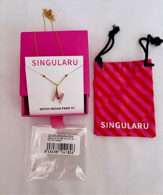 *SOLO ENVÍOS* Collar colgante con la letra M de la marca Singularu. Un diseño delicado y brillante. •Cadena (collar) plata bañada en oro de 45cm + 5cm alargador. Precio original: 36€ •Colgate letra M plata bañada en oro con circonitas. Altura 12,7mm. Grosor 2,6mm con circonita de 1,5mm. Asa soldada de 8,4 x 5,7mm. Precio original: 26€ TOTAL: 62€ (ahora en rebajas 50€) - Plata de Ley 925. - Baño de Oro de 18kt. - Decorado con piedras rosas y blancas. - Largo de 45cm con extensor de 5cm.