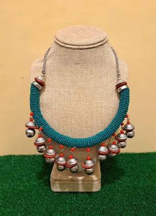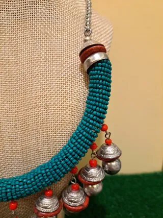 Este collar étnico de estilo afgano presenta un diseño único con detalles de campanas. - Elaborado con cuentas turquesas. - Adornado con cascabeles plateados y detalles en color coral. - Cadena de eslabones plateada.