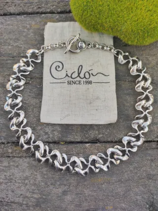 Collar corto de la marca española Ciclón de piezas de metal bañado en plata con cierre de palito. Envío en bolsita de organza a cargo del comprador. No se admiten devoluciones.