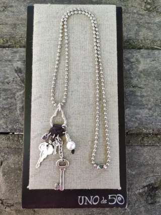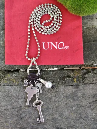 Collar largo de la marca española Uno de 50 modelo man-ojito con cadena de bolas de metal bañado en plata y colgante con varios charms con forma de llave y perlas sintética. Envío a cargo del comprador. No se admiten devoluciones. #Ajarbe