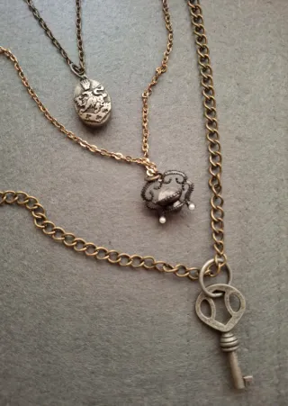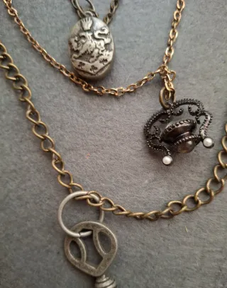 -Collar de Alice Cullen -Tres cadenas unidas, con un dije ovalado con grabado de león de la casa Cullen, colgante con forma de llave antigua. - Cadena con eslabones dorados y plateados.