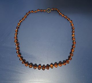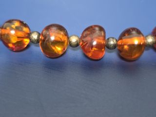 Elegante collar con cuentas de ámbar y detalles en plata. - Cuentas de ámbar de tono marrón. - Elementos de cierre y entrepiezas en plata. Extendido mide 57 cm Peso 24 gr.