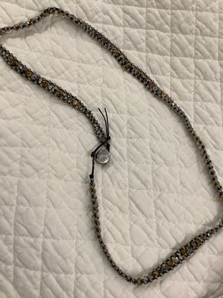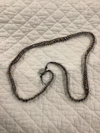 Elegante collar largo con cuentas de hematita. Su diseño combina tonos negros y plateados, aportando un toque sofisticado. - Cuentas de hematita. - Diseño largo y versátil. Medida 40 x 2 cm Cuentas irregulares No lleva broche al ser largo