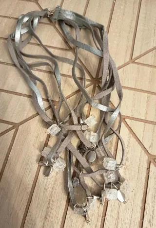 Collar artesanal con un diseño único y elegante. - Cintas plateadas entrelazadas. - Colgantes de cubos transparentes.