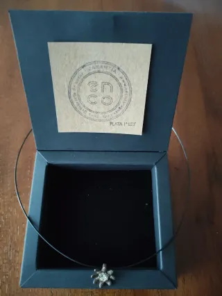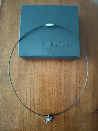 Collar de la marca Enco con un diseño delicado. - Colgante con forma de sol. - Incluye sirga de acero negra con recubrimiento de vinilo. Cierre rosca. Largo: 45 cm - Fabricado en plata de 1ª ley. - Está en perfecto estado