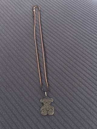 Collar de la marca Tous con un diseño de oso grande de plata La cadena es de dos tonos, combinando dorado y acero negro. - Diseño de oso. - Cadena bicolor. Costo 250€.