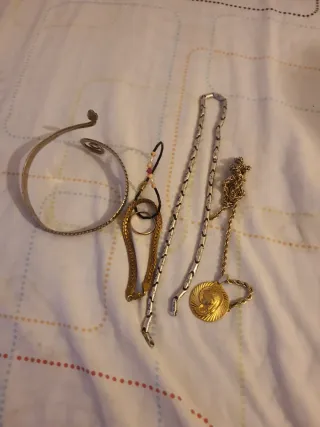 Conjunto de varias piezas de joyería. - Brazalete con diseño espiral. - Collar con cuentas de colores. - Cadena de eslabones plateada. - Cadena dorada con colgante de