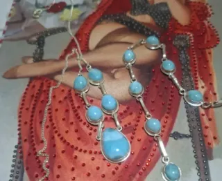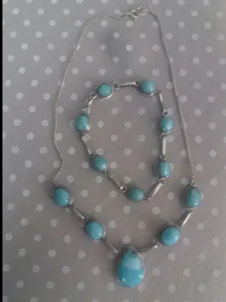 Elegante conjunto de joyería de plata. - Collar con colgante y varias piedras. - Pulsera a juego con piedras. - Diseño con piedras de color turquesa.