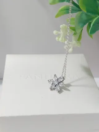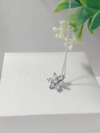 Elegante collar de la marca Pandora con un delicado diseño de flor. - Cadena fina de plata. - Colgante con forma de flor adornado con pequeñas gemas.