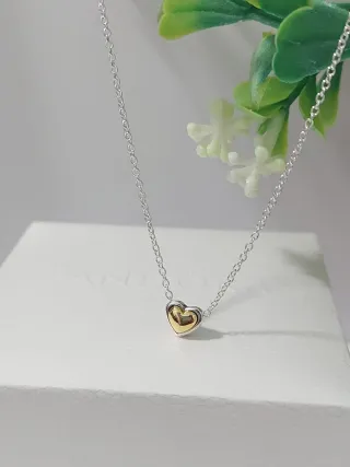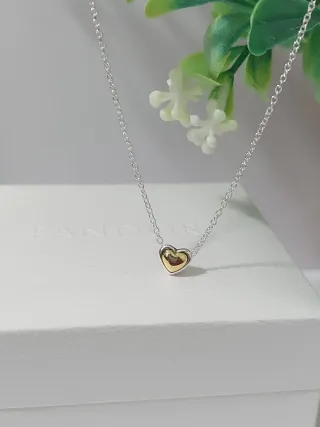 Elegante collar de la marca Pandora con un diseño de corazón. - Colgante con forma de corazón. - Combinación de tonos dorados y plateados. Viene con joyero pequeño