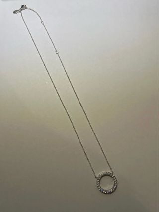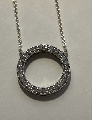 Elegante collar de la marca Pandora con un diseño circular adornado con pequeñas piedras brillantes. Una pieza delicada y sofisticada. - Diseño de círculo abierto. - Incrustaciones de circonitas. - Cadena fina y ajustable.
