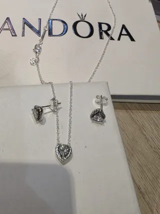 Elegante conjunto de joyería de la marca Pandora. -También disponible el amillo, precio aparte - Diseño con circonitas cúbicas. - Plata de ley . - Incluye collar y pendientes.