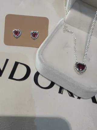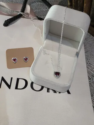 Precioso conjunto de joyería de la marca Pandora. - Diseño de corazón con gema roja. - Incluye collar y pendientes. - Acabado en plata.