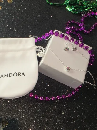 Precioso conjunto de joyería Pandora. - Incluye collar y pendientes. - Diseño de corazón con detalles rosas. - Acabado en plata.