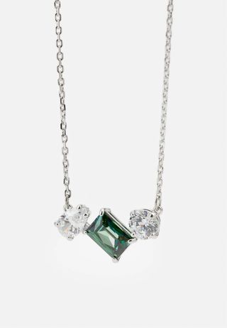 ¡¡PRECIO NEGOCIABLE!! Elegante collar Swarovski con un diseño moderno y sofisticado. Perfecto para añadir un toque de brillo a cualquier atuendo. - Colgante central con forma rectangular en tono verde. - Dos cristales transparentes a cada lado del colgante principal. - Cadena fina en tono plateado.