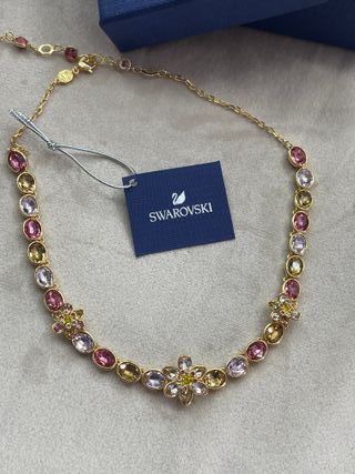 Elegante collar de la marca Swarovski con piedras de diversos colores. - Diseño con incrustaciones de gemas. - Acabado en tono dorado.