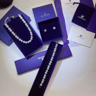 Elegante conjunto de joyería de la marca Swarovski. - Incluye collar, pulsera y pendientes. - Diseño con cristales brillantes. - Presentado en su caja original.