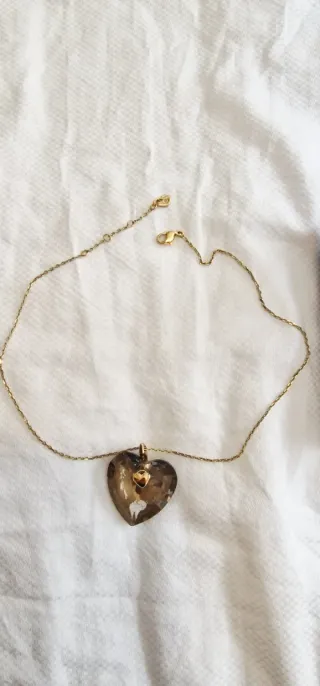 Elegante collar con colgante de corazón de Swarovski. La cadena es dorada y el cristal del corazón tiene tonos marrones y dorados, con un pequeño corazón dorado en el centro. - Colgante de cristal tallado en forma de corazón. - Pequeño corazón dorado integrado en el colgante. - Cadena fina y delicada. - El corazón tiene un ligero desgaste, tal como se ve en las fotos, pero puedes darle nueva vida. Envío cuidadosamente en su caja Swarovski. Visita otros artículos que tengo en venta.