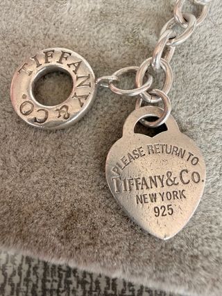 Elegante collar de Tiffany & Co. con un diseño clásico. - Fabricado en plata de ley 925. - Incluye charm en forma de corazón con la inscripción Please Return to Tiffany & Co. New York 925. - Cuenta con un charm circular con el logo de Tiffany & Co. El cierre esta cambiado porque el otro se rompió , se que este collar vale mucho mas pero como el cierre fue cambiado de hay su precio , tiene señales de uso Envio a toda españa