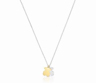 Elegante collar de la marca Tous con un diseño bicolor que combina tonos dorados y plateados. Es un accesorio versátil y llamativo. - Diseño de doble cadena. - Colgante con forma de oso. - Cierre de mosquetón.