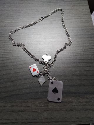 Elegante collar largo de la marca Tous, modelo Eugenia. Una pieza llamativa con un diseño único. - Diseño con motivos de cartas de póker. - Cadena plateada. - Detalles en rojo y negro. Se entrega en sobre Tous