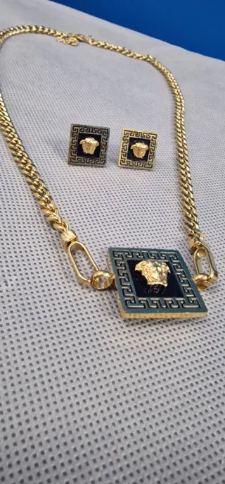 Elegante conjunto de joyería de acero inoxidable de la mejor calidad color oro compuesto por cordon con colgante con una chapa con el símbolo de Versace de 3 cm con pendientes a juego y pulsera todo el lote por 55€. - Diseño con detalles en negro y dorado. - Incluye collar, pulsera y pendientes.