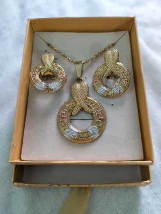 Conjunto de joyería de acero inoxidable de la mejor calidad color oro con el símbolo de Versace. - Diseño circular con patrón griego. - Incluye collar y pendientes a juego.