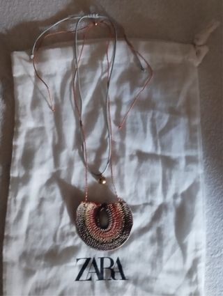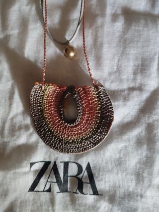 Collar de la marca Zara con un diseño llamativo. - Colgante con detalles tejidos en varios tonos. - Cadena fina con cierre ajustable. - Detalle de cuenta dorada en la cadena.
