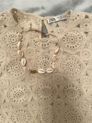Top de Zara con un bonito diseño de crochet en color beige. Ideal para un look veraniego. - Tejido de crochet. - Cierre en la nuca. - regalo collar de conchas y cadena dorada.