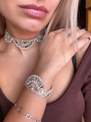 Elegante conjunto de accesorios que incluye un collar tipo gargantilla y una pulsera a juego. Ambos complementos están adornados con perlas y detalles de espejo. - Collar con diseño de abanico y perlas. - Pulsera con incrustaciones de espejo y perlas.