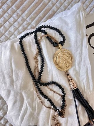 Colgante marca Zara edicion especial, perfecto estado, con bolsa guardapolvo - Collar largo con cuentas negras y detalles dorados. - Colgante con diseño de moneda antigua y plumas reales - Cadena fina adicional.