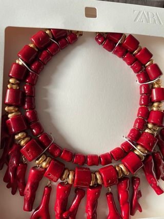Elegante collar de Zara con un diseño llamativo. - Piezas de coral rojo. - Detalles en cuentas doradas. - Colgantes en forma de coral.