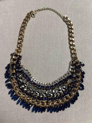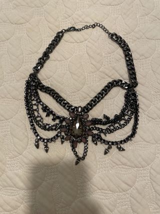 Collar en metal y tela tipo babero. Tonos robo, negro y algo de pedreria. Zara.