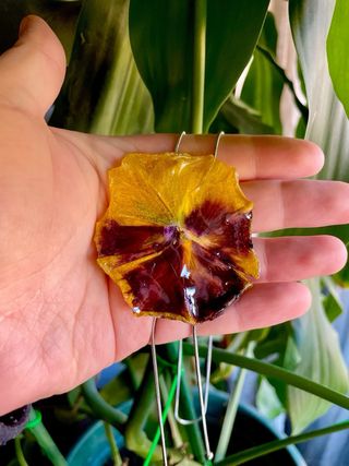 Collar con una flor de pensamiento encapsulada. - Colgante de flor. - Cadena dorada con pequeñas cuentas.